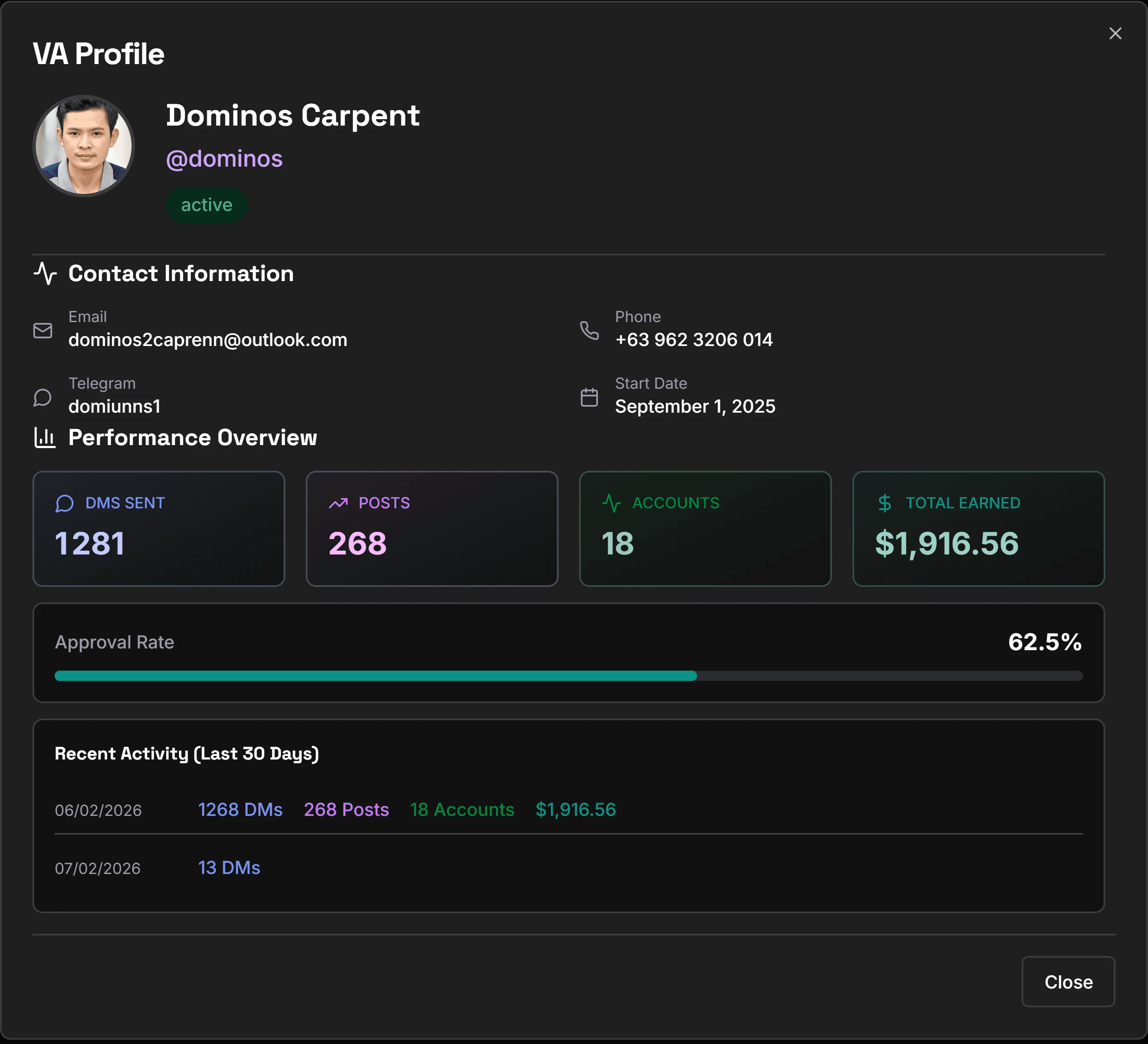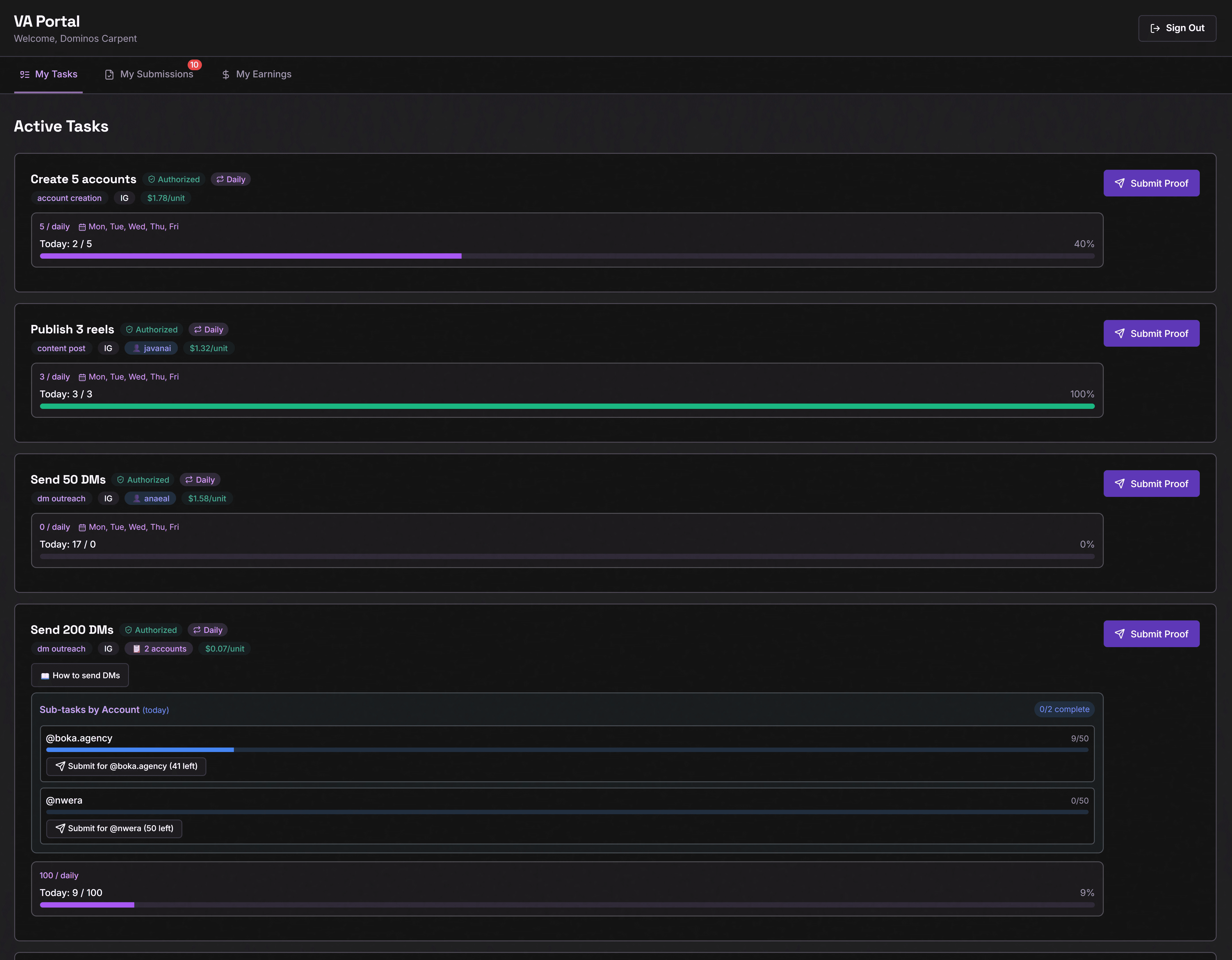 Give your VAs access to their portal where they can submit proof of their work, view tasks, SOPs, earnings, etc.